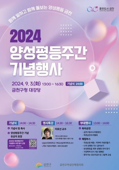 유성훈 금천구청장은 “양성평등주간을 맞아 다채로운 행사를 준비한 만큼 관심 있는 주민의 많은 참여를 바란다”라며, “앞으로도 누구나 차별받지 않고, 동등한 권리와 기회를 누릴 수 있는 도시를 만드는 데 최선을 다하겠다”라고 전했다.