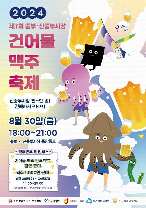 28일과 29일에는 오후 2시부터 8시까지 중부·신중부시장 1문과 5문 일대에서 다양한 건어물 안주세트를 저렴하게 구매할 수 있으며, 맥주 부스도 함께 운영돼 본격적인 축제에 앞서 분위기를 예열한다.