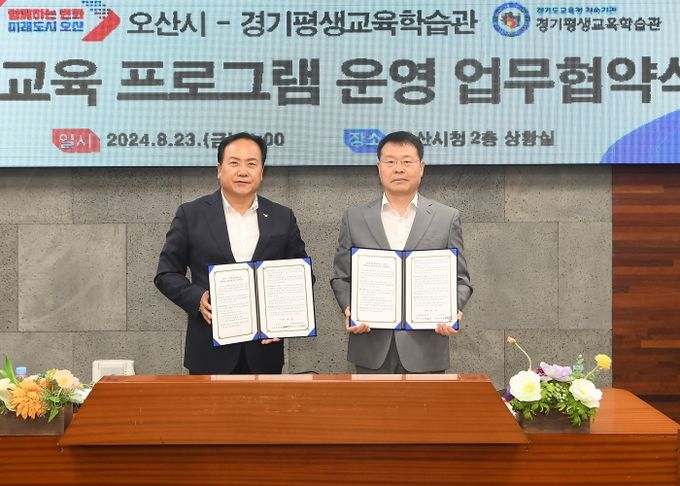 (아름다운교육신문) 오산시는 경기평생교육학습관과 23일 오산시청에서 이권재 오산시장, 조정수 경기평생교육학습관장 등이 참석해 업무협약을 체결해 평생교육 활성화에 협력하기로 했다.