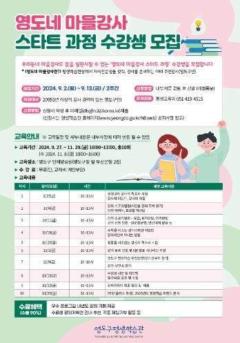 (아름다운교육신문) 부산시 영도구는 평생학습 지식전문성을 갖춰 마을강사를 준비하는 지역주민을 대상으로 영도네 마을강사 스타트과정 수강생을 모집한다.