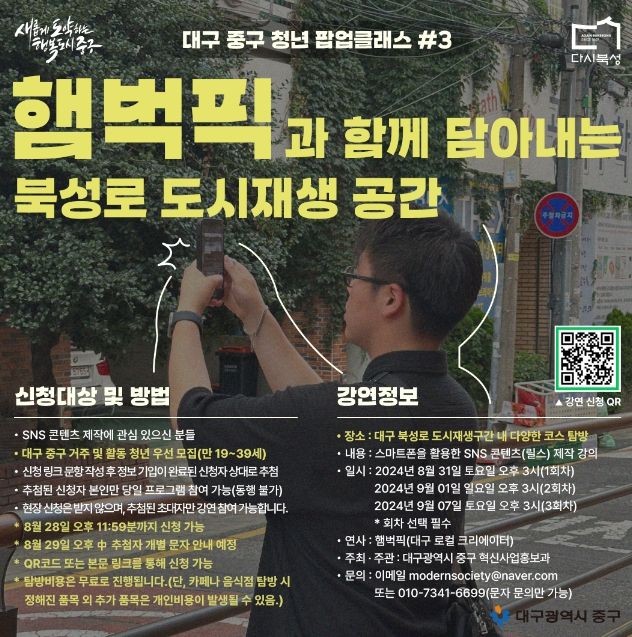 (아름다운교육신문) 대구 중구는 청년들을 대상으로 ‘2024년 청년 팝업클래스’의 세 번째 시간을 북성로 내 도시재생구간에서 개최한다.