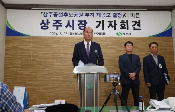 강영석 시장은 26일 오전 10시 30분 상주시청 브리핑룸에서 기자회견을 갖고 상주공설추모공원 부지 재공모 결정을 시민에게 발표했다.