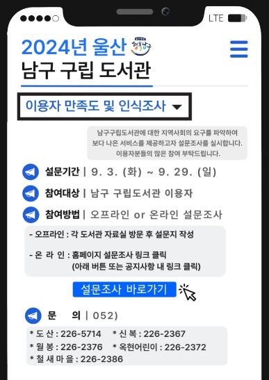 남구 구립도서관은 지역주민과 도서관 이용자의 의견을 수렴해 2025년 구립도서관 운영계획 및 정책 수립을 위한 기초자료로 활용할 예정이다.