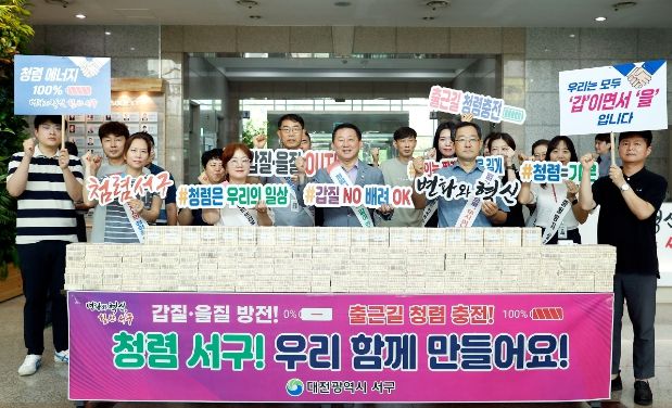 한편, 서구는 구민들로부터 신뢰받는 청렴 서구 구현을 위해 8월 26일부터 8월 30일까지 ‘청렴 주간’으로 정하고 직급별 맞춤형 청렴 교육, 갑질·을질 없는 청렴한 조직문화 제안 공모, 온라인 부패행위 모의 신고 훈련 등 다양한 청렴 프로그램을 진행한다.