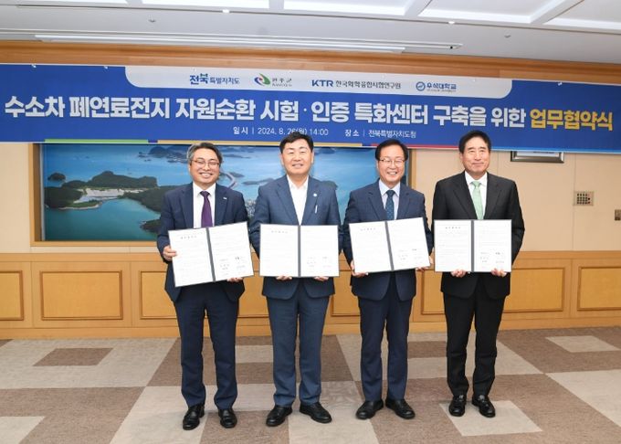 이날 협약식에는 김관영 전북특별자치도지사, 유희태 완주군수, 김현철 KTR 원장, 박노준 우석대학교 총장 등이 참석해 수소차 폐연료전지 자원순환 경제 육성을 위해 손을 맞잡았다.