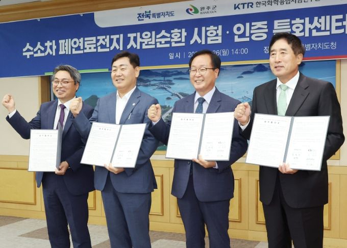 전북자치도는 26일 오후 2시 도청 회의실에서 김관영 전북자치도지사와 유희태 완주군수, 김현철 KTR원장, 박노준 우석대학교 총장 등이 참석한 가운데'수소차 폐연료전지 자원순환을 위한 시험·인증 특화센터 구축을 위한 업무협약(MOU)'을 체결했다고 밝혔다.