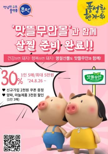 (아름다운교육신문) 전남 무안군은 다가오는 추석을 맞아 농특산물 온라인 판매처 ‘맛뜰무안몰’에서 30% 할인 기획전을 진행한다.
