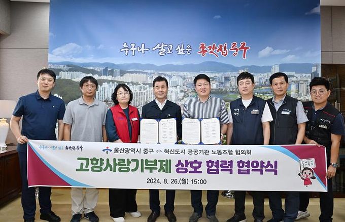 (아름다운교육신문) 울산 중구와 혁신도시 공공기관 노동조합 협의회가 8월 26일 오후 3시 중구청 구청장실에서 고향사랑기부제 활성화를 위한 ‘고향사랑기부제 상호 협력 협약’을 체결했다.