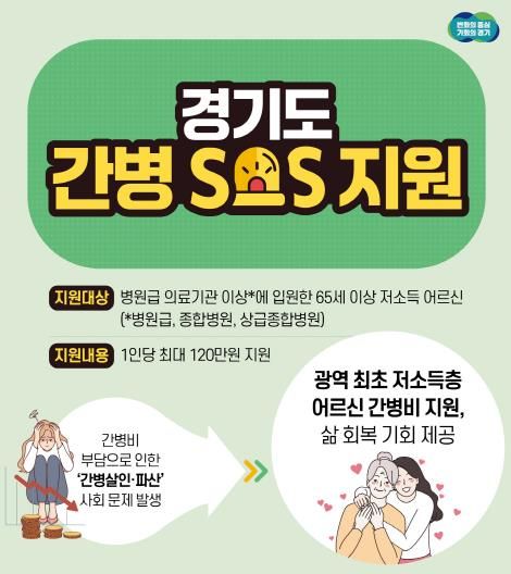 경기도 간병 SOS 지원 사업은 국가 간병지원체계 마련 촉구를 위한 시범사업이다. 경기도에 거주하는 저소득층 중 상해·질병 등으로 병원급 의료기관 이상에 입원해 간병서비스를 받은 65세 이상 노인이 지원 대상이다.
