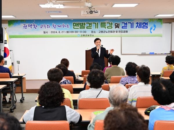 (아름다운교육신문) 고령군은 전국적으로 불어닥치고 있는 맨발걷기 열풍에 부응하고 고령군 걷기실천율 향상 및 비만율 감소를 위하여 맨발학교 교장 권택환 교수를 초청하여 2024년 8월27일 9시 30분 군노인회관 대회의실에서 맨발 걷기 특강을 실시하고 연조공원에서 걷기대회를 개최했다.