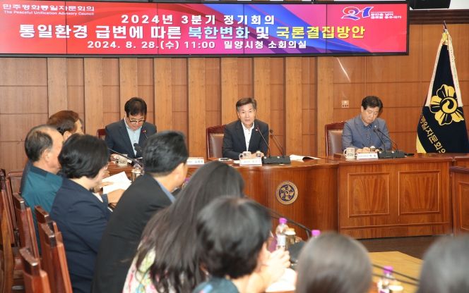 (아름다운교육신문) 민주평화통일자문회의 밀양시협의회는 28일 시청 소회의실에서 안병구 밀양시장, 자문위원 등 40여 명이 참석한 가운데‘통일환경 급변에 따른 북한 변화 및 국론결집 방안’을 주제로‘2024년 3분기 정기회의’를 개최했다.