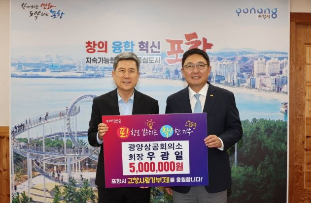 이날 기탁식에는 나주영 포항상공회의소 회장도 함께 참석해 자매도시 광양에 대한 애정을 드러냈다.