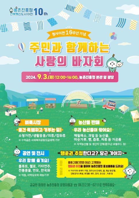 (아름다운교육신문) 농촌진흥청은 전북혁신도시 이전 10주년을 기념해 9월 3일 본청 본관 앞 광장에서 ‘주민과 함께하는 사랑의 바자회’를 연다. 농촌진흥청은 지난 2014년 7월, 52년간의 경기 수원 시대를 마감하고 전북혁신도시로 이전해 올해로 10년째를 맞고 있다.