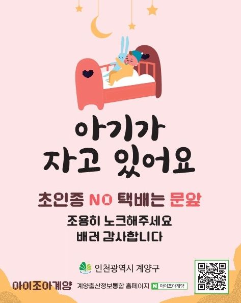 제작된 스티커에는 ‘아기가 자고 있어요, 조용히 노크해 주세요’라는 문구가 적혀있어 방문객이 초인종 대신 노크를 하도록 유도하고 있다. 스티커의 뒷면은 자석으로 제작해 가정 현관문에 쉽게 붙일 수 있으며, 스티커 하단의 QR코드를 스캔하면 계양구 출산정보통합누리집인 ‘아이조아계양’으로 연결돼 다양한 출산·육아 정보도 얻을 수 있다.