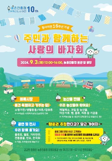 (아름다운교육신문) 농촌진흥청은 전북혁신도시 이전 10주년을 기념해 9월 3일 본청 본관 앞 광장에서 ‘주민과 함께하는 사랑의 바자회’를 연다. 농촌진흥청은 지난 2014년 7월, 52년간의 경기 수원 시대를 마감하고 전북혁신도시로 이전해 올해로 10년째를 맞고 있다.