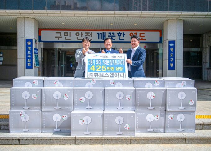 (아름다운교육신문) ㈜큐브스엘이디는 지난 8월 30일 추석을 맞아 영도구를 방문하여 선풍기 50대 및 카래온(밀키트) 500개(425만원 상당)를 기탁했다.