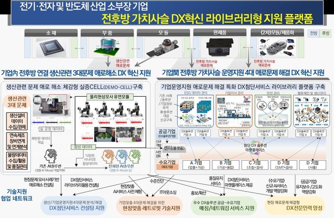 이를 위해 디지털 전환을 위한 플랫폼과 인프라를 구축하고, △기업 간 전후방 가치사슬 및 생산공정 DX 지원 △현장 인력 실무교육 △DX 전환 수요·공급 기업 네트워크 구축 등을 통해 중소·중견기업의 경쟁력 강화를 이끌어낼 예정이다.