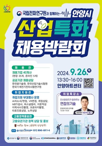 (아름다운교육신문) 안양시는 국립전파연구원과 함께 ‘산업특화 채용 박람회’를 오는 9월 26일 오후 1시 30분 안양아트센터에서 개최한다고 1일 밝혔다.