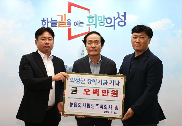 김주수 의성군수는 “농업회사법인㈜참의 적극적인 지역 상생노력에 감사드린다”라며 “이번 장학금 기탁이 우수 인재를 육성하는 데 보탬이 될 수 있도록 최선을 다하겠다.”라고 전했다.