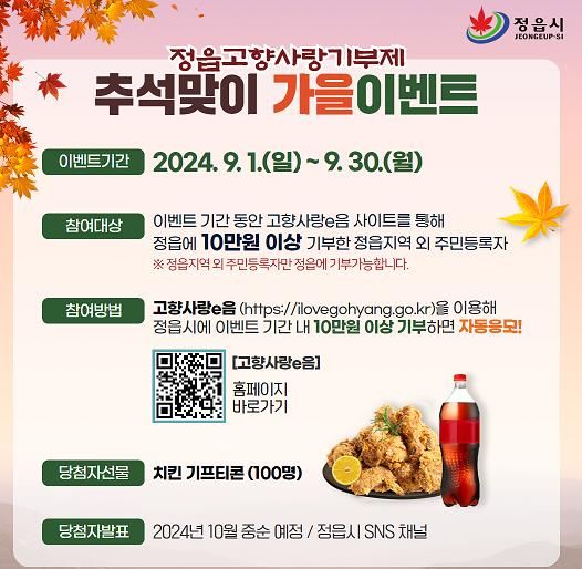 (아름다운교육신문) 정읍시는 다가오는 추석 명절을 맞아 ‘고향사랑기부제 추석맞이 가을이벤트’를 진행한다.