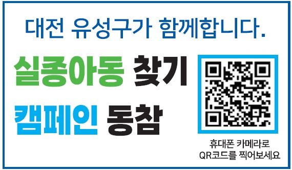 유성구는 보건복지부 산하 아동권리보장원의 협조를 받아, 오는 10일부터 발송되는 9월 정기분 재산세 고지서(약 15만 건)에 『실종 아동들의 인적정보를 담은 큐알(QR)코드』를 삽입함으로써 지역사회의 실종 아동 찾기 노력을 한층 강화할 계획이다.