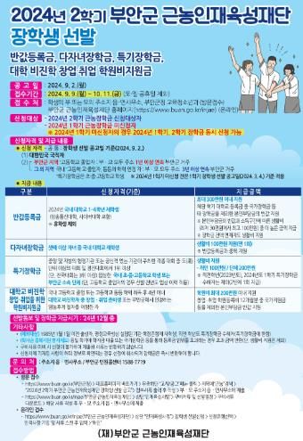 (아름다운교육신문) 부안군 근농인재육성재단은 2024년 2학기 장학생 신청 접수를 위해 각종 홍보자료를 준비하고 온라인 접수 시스템을 정비하는 등 장학금 지급 준비를 모두 마쳤다고 전했다.