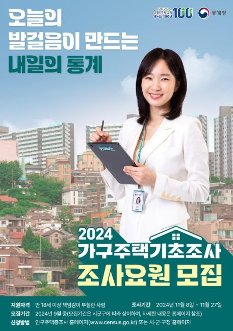 이형일 통계청장은 “2024 가구주택기초조사의 성공적 실시를 위해 조사요원 모집에 많은 관심을 가지고 적극적으로 참여해주시기 바란다”고 전했다.