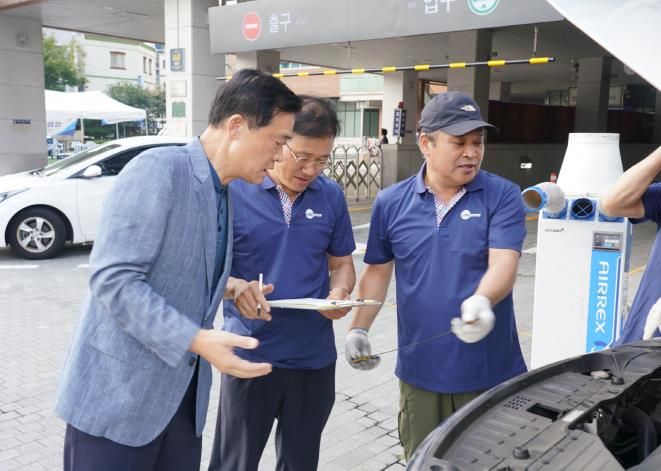 이날 총 224대 차량을 대상으로 무상점검 완료하고, 우천 시 안전한 운행을 위해 워셔액을 보충했다.