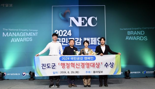 (아름다운교육신문) 전남 진도군이 지난 29일 서울 더 플라자 호텔에서 열린 ‘2024년 국민공감 캠페인’ 시상식에서 행정혁신경영 부문 대상을 수상했다. ‘국민 공감 캠페인’은 소통을 통해 변화와 혁신을 일으킨 지방자치단체, 기업·기관의 경영 사례와 브랜드를 발굴해 사회에 알리기 위해 마련됐으며, 동아일보가 주최하고 행정안전부·과학기술정보통신부·산업통상자원부 등 10개 기관이 후원한다.