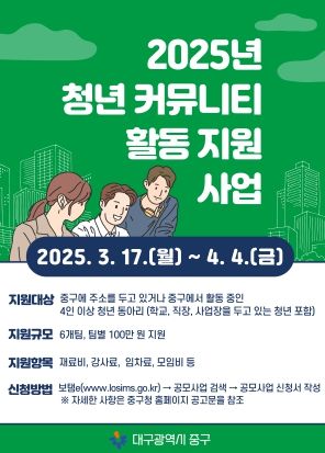 (아름다운교육신문) 대구 중구는 청년들의 지속적인 관계망 형성과 자발적인 커뮤니티 활동을 지원하기 위해 ‘2025년 청년 커뮤니티 활동 지원사업’을 3년 연속 추진하며, 오는 3월 17일부터 참여자를 모집한다.