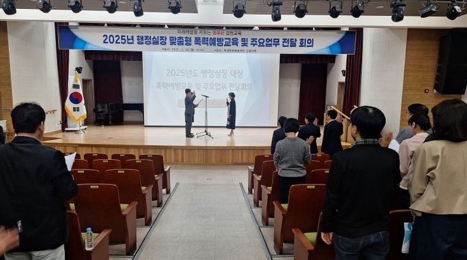 (아름다운교육신문) 경상북도김천교육지원청은 2025. 3. 24. 김천학생문화예술센터 드림마루에서 김천 관내 공립 단설유치원, 공‧사립 초‧중‧고등학교 및 소속기관 행정실장 50여명이 참석한 가운데 청렴다짐식 및 폭력예방교육, 주요업무 전달회의를 개최했다.