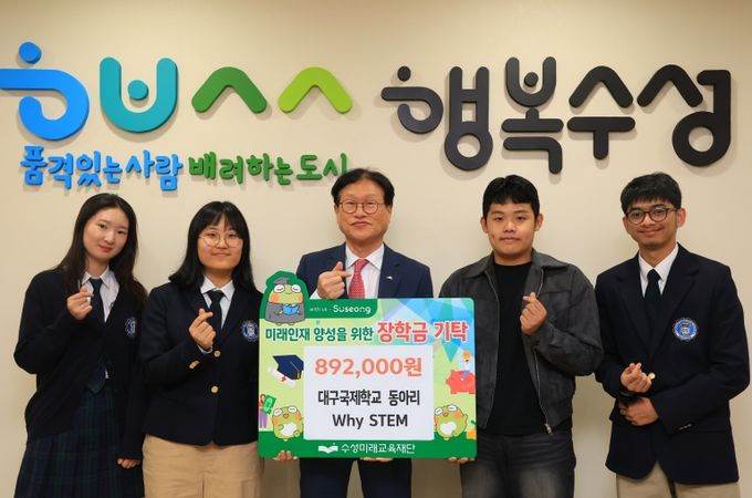 (아름다운교육신문) 대구국제학교 동아리 Why STEM은 지난 10일 미래인재 육성과 지역 교육발전을 위해 장학금 89만 2천 원을 수성미래교육재단에 전달했다.
