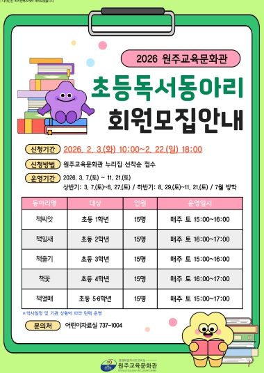 (아름다운교육신문) 원주교육문화관(관장 용석태)은 2월 3일부터 선정 도서를 깊이 읽는 활동을 통해 문해력을 강화하고 지역사회 독서 공동체를 활성화하기 위해 초등학생과 중학생을 대상으로 ‘2026년 독서동아리 회원 모집’을 실시한다.