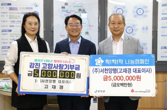 고재경 대표이사는 “고향사랑기부제와 희망나눔 캠페인을 통해 추억이 가득한 선친의 고향 발전에 기여할 수 있어 뜻깊다”며 “의미있는 기금사업으로 주민이 행복하고, 찾고 싶은 강진을 만들어 달라”고 밝혔다.