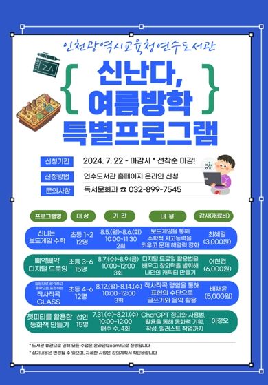 연수도서관은 여름방학을 맞아 초등학생뿐 아니라 지역주민에게 즐겁고 유익한 학습 경험의 기회를 제공하기 위해 7월 31일부터 8월 21일까지 '신난다, 여름방학' 특별프로그램을 운영한다.