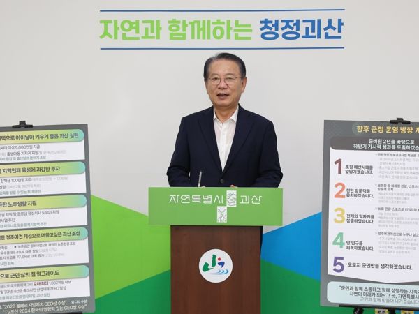 (아름다운교육신문) 송인헌 괴산군수가 24일 괴산군청 브리핑룸에서 민선8기 2주년을 맞아 기자회견을 가졌다.