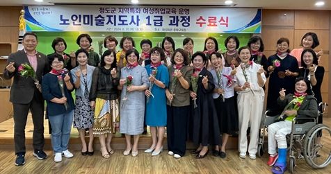 (아름다운교육신문) 청도군은 지난 20일 여성회관 종합교육장에서 수료생 18명이 참석한 가운데 지역특화 여성취업교육 ‘노인미술지도사 1급 자격 과정’ 수료식을 가졌다.