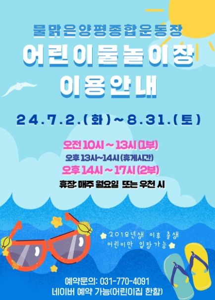 (아름다운교육신문) 양평공사는 7월 2일부터 8월 31일까지 총 두 달에 걸쳐 어린이들의 무더위를 날려줄 도심 속 피서지인 ‘물맑은양평종합운동장 어린이 물놀이장’을 개장한다고 밝혔다.