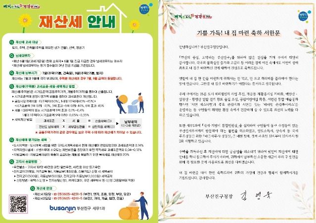 (아름다운교육신문) 부산 부산진구는 생애 최초로 주택을 취득한 신규 재산세 납세자에게 주택 취득의 기쁨을 함께 나누는 ‘구청장 축하 서한문’ 및 ‘재산세 안내문’을 6월 25일 발송한다고 밝혔다.