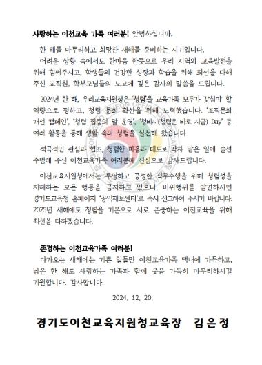 김은정 교육장은 이번 서한문을 통해 한 해 동안 청렴 의식을 생활화하고 청렴 문화를 확산하기 위해 협력한 모든 이천교육가족의 노력에 대해 감사 인사를 전했다.
