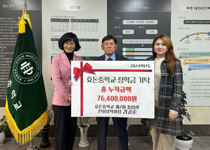 (아름다운교육신문) 제주도교육청 효돈중학교 동문인 천일장학회 김공순(제2회 졸업)선생은 2010년부터 올해까지 효돈중학교에 장학금 총 7640만원을 쾌척했다.