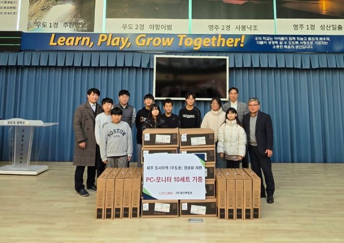 (아름다운교육신문) 제주도교육청 우도초·중학교는 지난해 12월 30일 학교 안뜰갤러리에서 ㈜대우루컴즈으로부터 도서 지역 학생의 정보화역량 증진을 위한 데스크탑 컴퓨터 기증식을 진행했다.