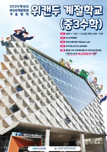 (아름다운교육신문) 부산광역시교육청창의융합교육원은 오는 7일부터 24일까지 중학교 3학년 학생 160명을 대상으로 부산수학문화관에서 겨울방학 위캔두 계절학교(중3 수학)을 운영한다.