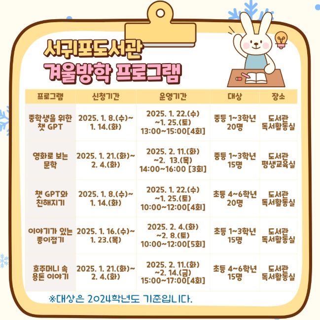 모집 프로그램은 ▲챗(Chat) GPT 의 올바른 사용법을 배워보는‘챗 GPT와 친해지기’(초등 4~6학년)와‘중학생을 위한 챗 GPT’(중등 1~3학년) ▲그림책 내용을 종이접기로 표현해보는‘이야기가 있는 종이접기’(초등 1~3학년) ▲합리적 소비 방법을 알아보는‘호주머니 속 용돈 이야기’(초등 4~6학년) ▲문학작품이 원작인 영화를 대상으로 독서토론을 하는‘영화로 보는 문학’(중등 1~3학년)이다.