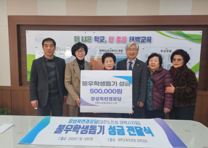 이날 전달식에는 권성자 교육장, 이진수 태백시 노인회장, 이정자 장성목련경로당 회장 등이 참석했으며, 성금은 태백지역 저소득층 학생들의 학업 및 생활 지원에 사용될 예정이다.