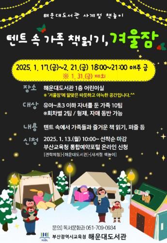 (아름다운교육신문) 부산광역시립해운대도서관은 17일부터 오는 2월 21일까지 매주 금요일마다 유아와 초등학생 3학년 이하 자녀를 둔 가족 10팀을 대상으로 해운대도서관 본관 어린이실에서 ‘텐트 속 가족 책읽기, 겨울잠’을 운영한다.