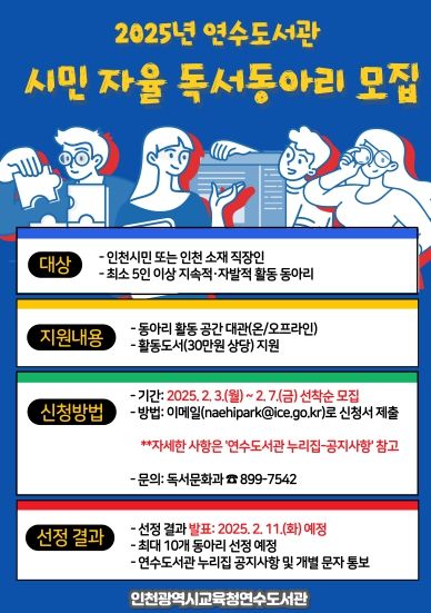 (아름다운교육신문) 인천광역시교육청연수도서관은 시민들의 자발적인 독서 활동을 지원하기 위해 ‘2025년 시민 자율 독서동아리’를 모집한다.