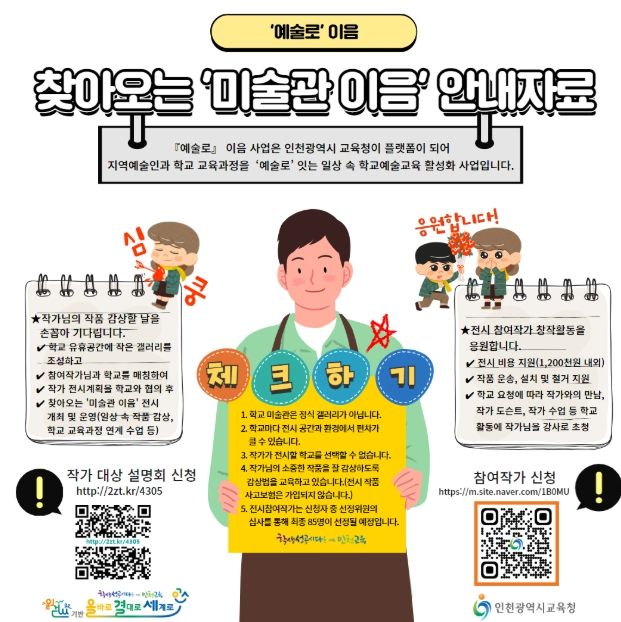 (아름다운교육신문) 인천광역시교육청은 2025년 ‘예술로’ 이음 사업의 일환으로 ‘찾아오는 미술관 이음’ 전시 참여 작가를 모집한다.