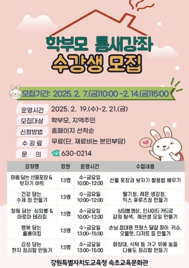 강좌는 2월 19일부터 21일까지 3회 차에 걸쳐 운영되며, 수강을 희망하는 경우 2월 7일 오전 10시부터 속초교육문화관 누리집을 통해 신청할 수 있다.