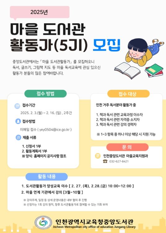 (아름다운교육신문) 인천광역시교육청중앙도서관은 ‘2025년 마을 교육공동체 지원사업’의 일환으로 마을교육기관에서 독서 교육 활동을 전개할 ‘마을 도서관 활동가’를 모집한다.